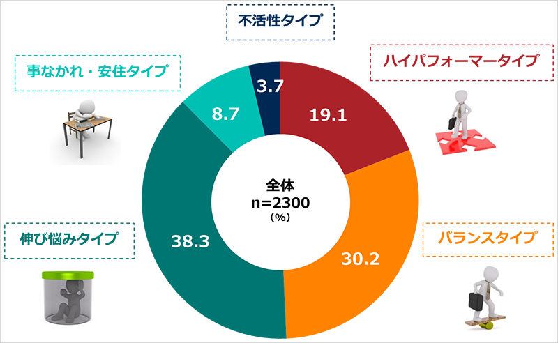 ※ミドル・シニア社員のタイプの分類と割合については、従業員300名以上の大規模企業に勤めるインターネットモニター2,300名を対象にした定量調査の結果であり、協力企業の従業員を対象とした調査の結果によるものではありません。