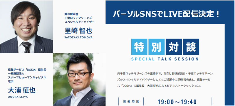 パーソルキャリア株式会社が運営する転職サービス「DODA(デューダ)」が、パシフィックリーグマーケティング株式会社と共に5月25日(金)にベルサール飯田橋ファーストで開催するイベント、「パ・リーグ キャリアフォーラム」で行うスペシャルトークセッション「プロフェッショナルから見たスポーツ業界の『人と組織』」を、パーソルグループの公式FacebookとtwitterにてLIVE配信します。ぜひ、ご覧ください。