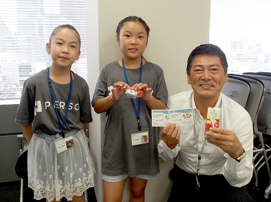 ほか、役員会議にお邪魔して、役員の皆さんにジュースや手づくりの「お仕事頑張ってカード」を配ったり、職場見学を兼ねて社員から不要な書類を回収し、シュレッダーにかけるといったお仕事体験もしました。