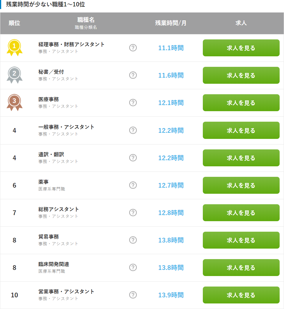 今回の調査で残業時間がもっとも少なかった職種は経理事務・財務アシスタントで、月間の残業時間は平均11.1時間でした。残業時間が少ない職種1位~10位を見てみると、アシスタント職種と医療系専門職が多くランクインしています。1位の経理事務・財務アシスタントは決算期付近が繁忙期であり、10位の営業事務・アシスタントは営業担当や顧客からの急な依頼が入り、想定外に帰宅が遅くなる日も発生します。その中で、月間の残業時間を10時間台に抑えることができているのは、この職種で働く人たちが「効率」や「生産性」を重視し、実践しているからだと考えられます。