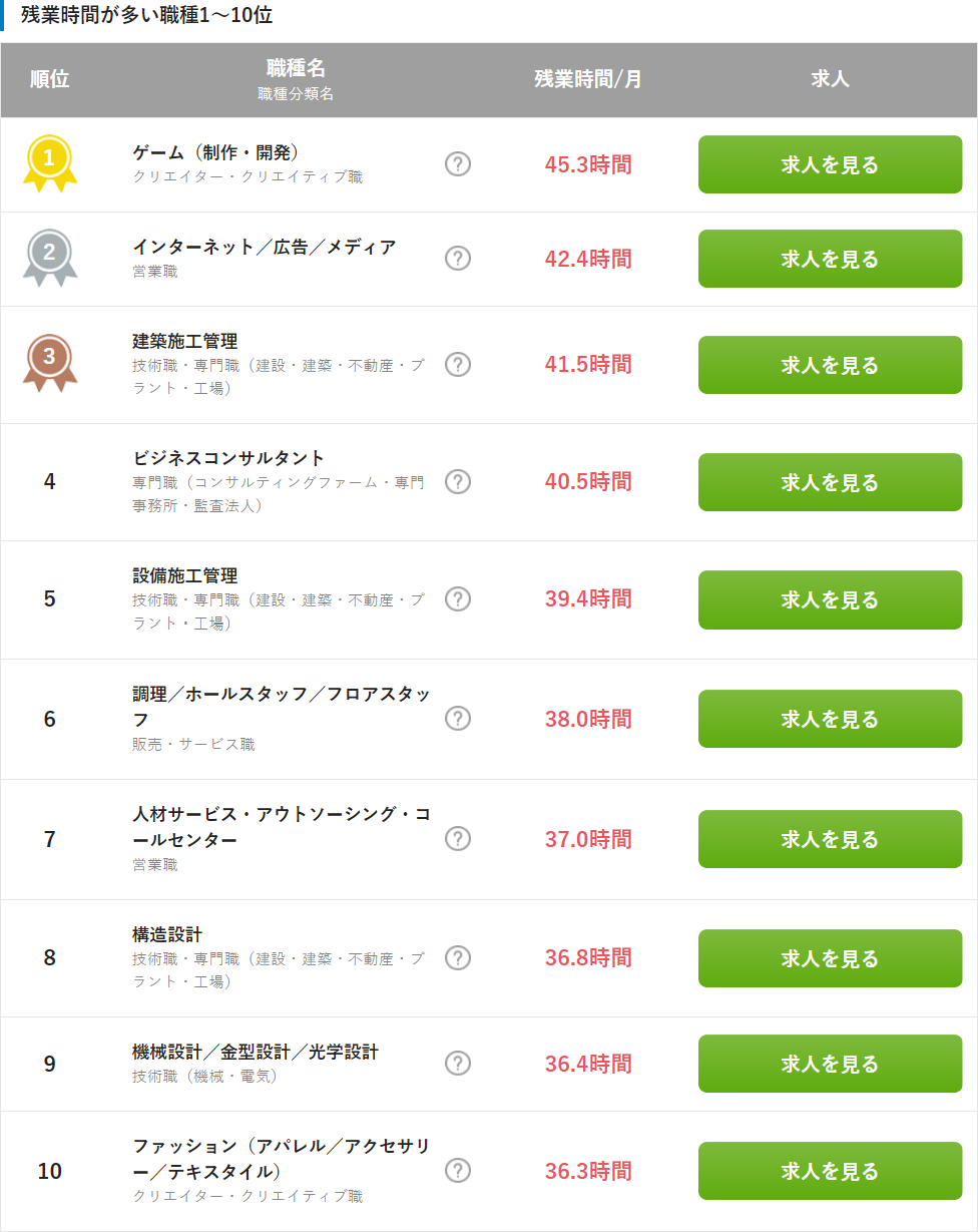 一方で、残業時間がもっとも多かった職種はゲーム(制作・開発)で、月間の残業時間は平均45.3時間でした。スマートフォンの普及によってゲーム人口は大幅に増加していますが、ゲーム開発の中でも、特にオンラインゲーム・携帯ゲーム・ソーシャルゲームは日々の改修や開発が求められる業界のため、スピーディな対応力が求められる職種です。また、3位と5位には施工管理職がランクインしました。オリンピック需要に伴う建設ラッシュがあちこちで発生しているにもかかわらず、分野によっては職人が少なく、なかなか工事が進まないこともあります。結果として工事スケジュールに遅れが発生しやすくなりますが、納期を厳守するために必要な残業が発生しているのだと考えられます。
