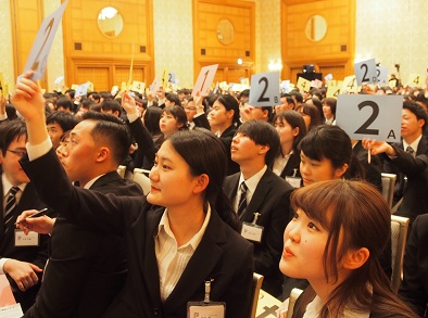 まずは、パーソルホールディングス株式会社 代表取締役社長 CEOの水田からメッセージが贈られ、その後グループ事業紹介ムービーの上映、パーソルグループの「5つの行動指針」(「誠実」「顧客志向」「プロフェッショナリズム」「チームワーク」「挑戦と変革」)のプレゼンテーションが行われました。その後、休憩を挟んで、パーソルクイズ大会、新入社員代表挨拶と進み、最後には全員集合で記念撮影。