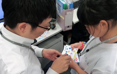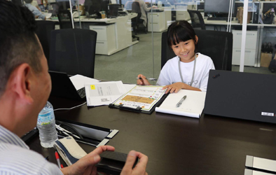 まず、社員に「お仕事がんばってください!」といいながら、事前につくった「お仕事がんばってカード」を手渡します。その後、お手伝いとして、破棄する書類を回収してシュレッダーボックスへ。終了したらスタンプカードにスタンプを押してもらいます。子どもたちのスタンプカートは、スタンプでいっぱい!そして、社員は皆、子どもたちの「がんばって」の励ましの言葉とお手伝いに癒され、「ありがとう」と笑顔でお礼。「〇〇さんのお子さん?大きくなったね」などと楽しく会話をする姿も見られました。