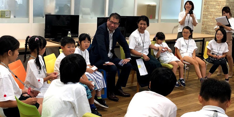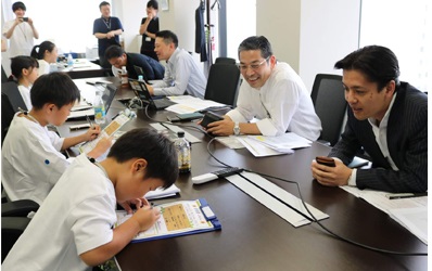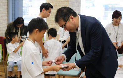 その後、円形になって座り、水田とざっくばらんに話をする時間が設けられました。子どもたちは、「好きな仕事はなんですか?」「好きなことはなんですか?」と、次々に水田に質問を投げかけます。それに対し、「好きな仕事は営業です」「好きなことは社員とのコミュニケーションをとることです」と、笑顔でわかりやすく答える水田。子どもたちは、そんな親しみやすい水田が社長であるパーソルグループに、これまで以上に好印象と興味を持った様子。この後に行われる「子どもPERSOL会議」のテーマを水田が発表する際には、真剣な表情で耳を傾けていました。