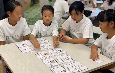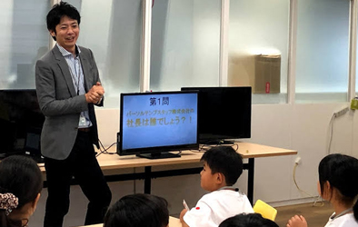 子どもたちの緊張をほぐすため、まずはクイズが行われました。出題されたのは、「パーソルテンプスタッフの社長は誰でしょう⁈」「パーソルグループのCMは誰が出ているでしょう⁈」といった、パーソルグループに関する4択クイズ4問。子どもたちにとっては少し難しい問題もありましたが、意見交換をすることで子どもたちは皆打ち解け、リラックスした雰囲気に。CMの問題では、全員の答えが「内村 光良さん」で一致し、大正解!大いに盛り上がりました。