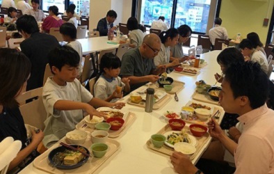 ランチは、社員食堂体験です。子どもたちは初めての社員食堂に大喜び。大人に混ざって、6種類あるメニューの中から、それぞれ好きなランチをセレクト。「おいしい」と社員食堂の味に大満足の様子でした。