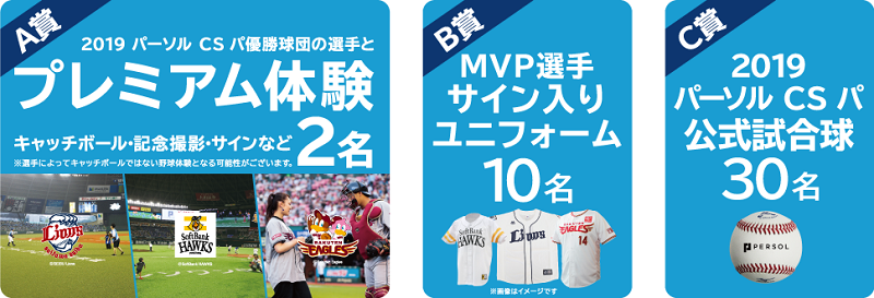 A賞:「2019 パーソル クライマックスシリーズ パ」優勝球団の選手とプレミアム体験(キャッチボール・記念撮影・サインなど) 2名さま