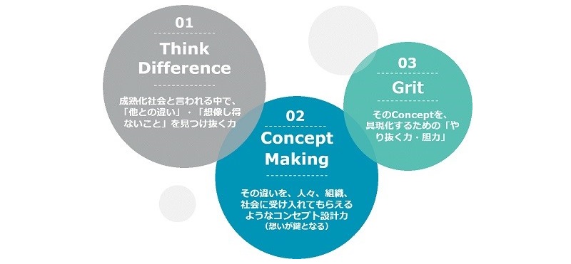イノベーション体質として、パーソルは(1)Think Difference(2)Concept Making(3)Gritの3つの要素を掲げています(以下詳細)。「Drit」は、この3要素を起点にしたプログラム設計を実装し、新規事業開発はもちろん、再現性のあるビジネスパーソンとしてのイノベーション体質への改善を目指していきます。