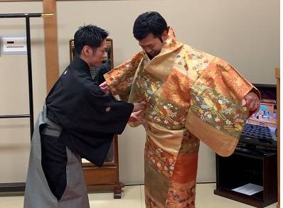 鑑賞を終えた参加者は、4つのグループに分かれ、ローテーションで「舞台に上り、摺り足の指導を受ける」「面(おもて)をつけ、視野の狭い中で動く」「装束を学び、身にまとう」「謡(うたい)のレッスンを受ける」の4つのプログラムに参加。普段は触れることができない面や装束を身にまとい、プロの能楽師の指導を受けながら、身体を動かしました。