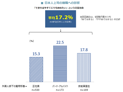小林:はい。外国人材をマネジメントしている社員に外国人材の受け入れについての指導や、定期的なヒヤリング面談を行っている企業は2割程度。そのため外国人部下を持つ日本人上司の30%が「ノウハウがなく、手探り状態である」と答えています。また、思っている以上に「自己主張が強かった」「日本の常識が通じない」といったといった、受け入れショック(想定外のネガティブなこと)を受けており、17.2%は「できれば今すぐにでも辞めたい」と回答しています。