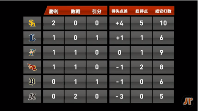 ルール:各球団2試合ずつ行い順位は各チームの勝率によって決定。