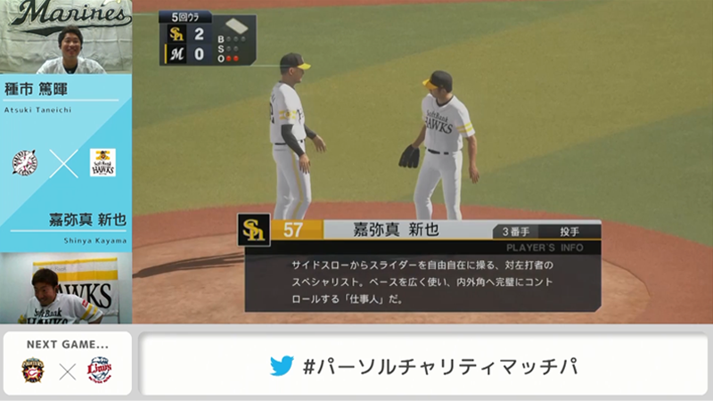 1回裏、千葉ロッテマリーンズの荻野貴司選手が出塁するも、事前に「プロ野球スピリッツ」を練習をしてきたという嘉弥真選手が見事な牽制でアウトに。そして、嘉弥真選手は3回表で今宮 健太選手のタイムリーで先制点をとり、5回表に甲斐 拓也選手、柳田 悠岐選手の連打で2点目を挙げると、5回裏、嘉弥真選手は自身をマウンドへ。2対0で逃げ切りました。