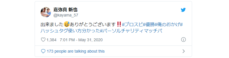 嘉弥真選手のツイート。ハッシュタグで「俺のおかげ」