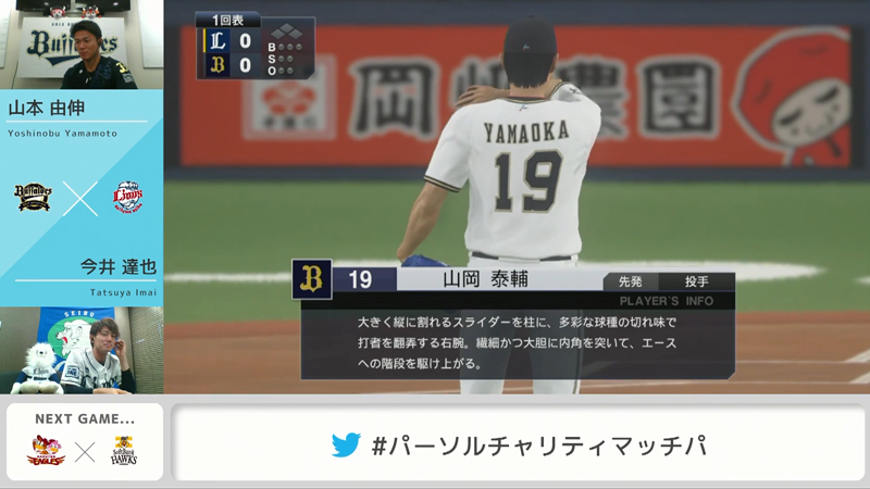 山本選手は、山岡 泰輔選手をマウンドへ。対する今井選手は、高橋 光成選手を先発投手に起用。1回表、山本選手は好投をみせ打線を3者凡退に。その1回裏、今井選手は安打を許すものの巧みな牽制により3人で抑えます。今井選手は試合中、合計3回の牽制を奪い、山本選手は巧みな配球で得点を許さず、試合は引き分けのまま終了しました。