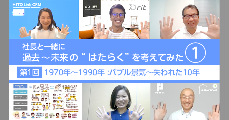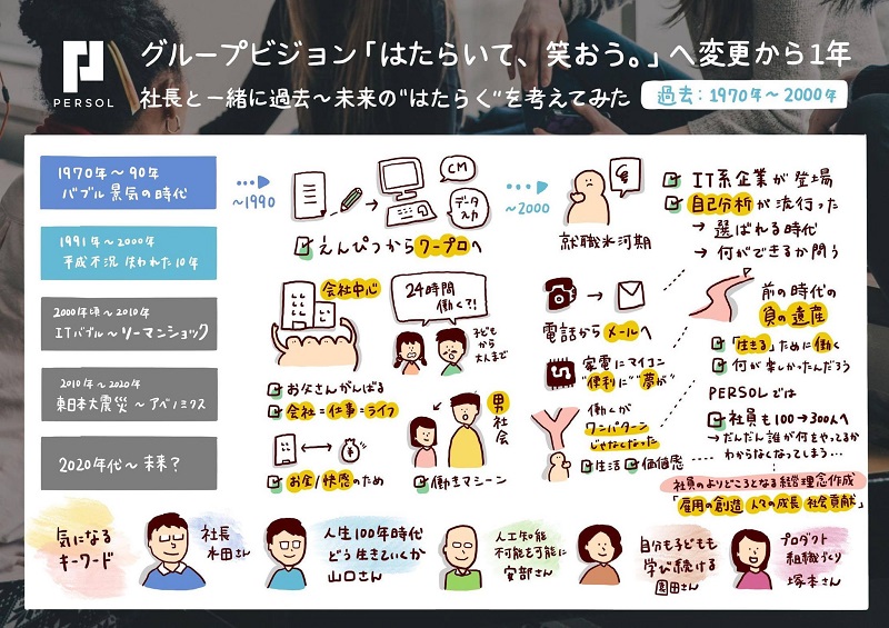 パーソルグループが、グループビジョン「はたらいて、笑おう。」を発表してから、2020年10月で1年が経ちます。新型コロナウイルス(以下、コロナ)の影響を受けて人々のはたらき方が大きく変化しているいま、私たちはどうあるべきか。過去から学び、未来の“はたらく”を考えるため、パーソルホールディングス代表取締役社長 CEOの水田 正道と、パーソルグループの社員が一緒に考えてみました。1970年から未来の2030年までを、計3回に分けてお届けします。