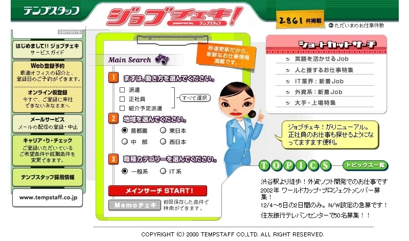 2000年、「テンプスタッフ」は仕事情報検索サイト「ジョブチェキ!」をスタート。派遣スタッフはインターネットでの仕事探しができるように