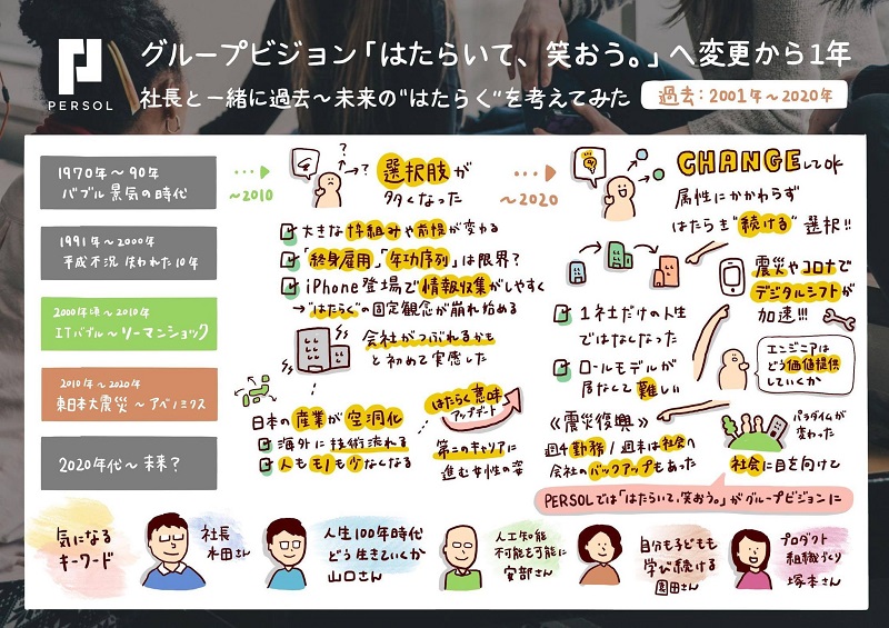 パーソルグループが、グループビジョン「はたらいて、笑おう。」を発表してから、2020年10月で1年が経ちます。新型コロナウイルス(以下、コロナ)の影響を受けて人々のはたらき方が大きく変化しているいま、私たちはどうあるべきか。過去から学び、未来の“はたらく”を考えるため、パーソルホールディングス代表取締役社長 CEOの水田 正道と、パーソルグループの社員が一緒に考えてみました。1970年から未来の2030年までを、計3回に分けてお届けします。