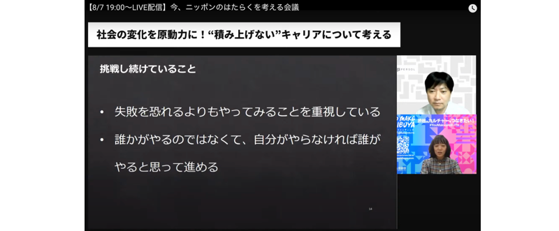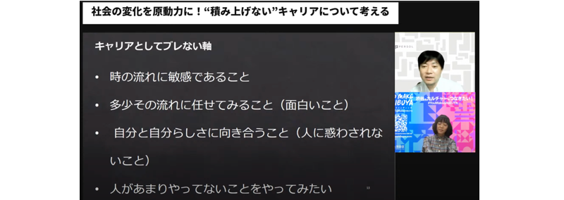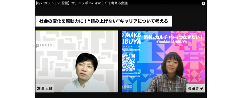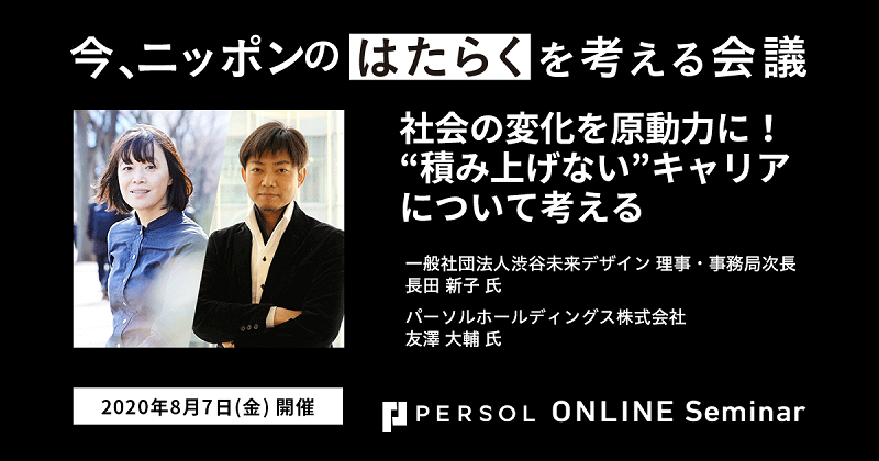 8月7日(金)19時から行われた第3回目のテーマは「社会の変化を原動力に!“積み上げない”キャリアについて考える」。一般社団法人渋谷未来デザイン 理事・事務局次長 長田 新子氏をゲストスピーカーにお招きし、コロナ禍においても、自らのキャリアを積極的に拡張し続けている人は、はたらき方・キャリアの描き方をどのように考えているのかを探りました。モデレーターはパーソルホールディングスでデジタル変革責任者やデータガバナンスなどを手掛けている友澤 大輔です。長田氏のキャリアを通して、変化すること、キャリアとしてブレない軸について聞きました。