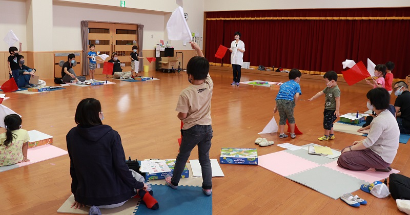 はじめに行ったのは、赤と白の旗揚げゲーム。