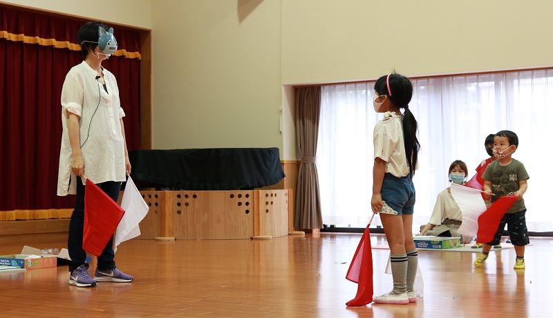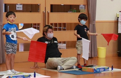 そして、子どもたちに向かって旗揚げの指示を出しました。「プラ上げて!」。子どもたちは意味が分からず、手を挙げられません。