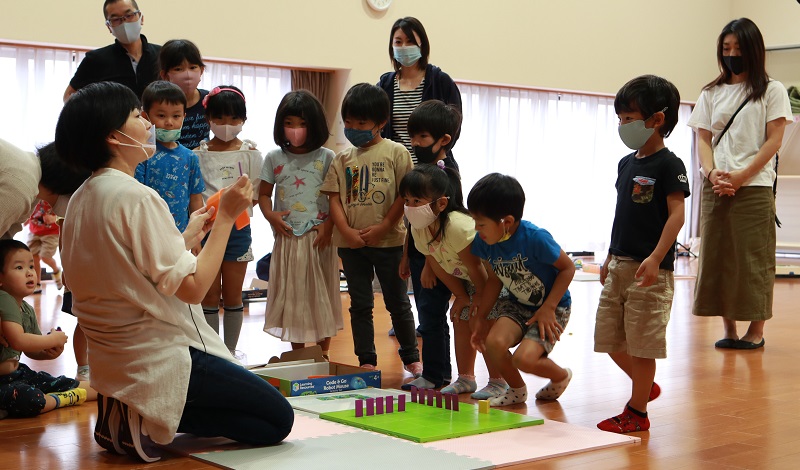 開催したのは、保育園の体育館。参加した10組の親子がソーシャルディスタンスを保ち、広く車座になったところでプログラムがスタート!