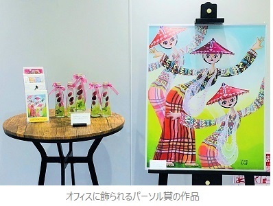 パーソルグループで独自に設けた「パーソル賞」に輝いたのは、NAMYさんの『みんな笑顔で平和な世界』。今年はパーソルグループ社員が審査員となり、オンライン投票により選出されました。NAMYさんにはパーソルグループの特例子会社であるパーソルサンクス株式会社が運営する「まえばし彩(いろどり)工房」で、障害を持つ社員が製作したハーバリウムと、「とみおか繭工房」で製作した富岡シルクを活用した賞状ホルダーが贈呈されました。NAMYさんの作品は今後、パーソルグループのオフィス内装やノベルティグッズに活用される予定です。