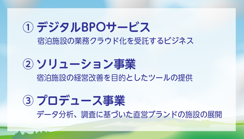 留田:Dot Homesの事業は次の3つがあります。どれもデータを介して宿泊業にアプローチするものなのですが、これらの事業を通して業界をアップデートしていきたいと思っています。