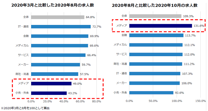 また、その後の8月から10月の求人数を見ると、「メディア(web広告など)」の回復率がもっとも高いという結果になりました。