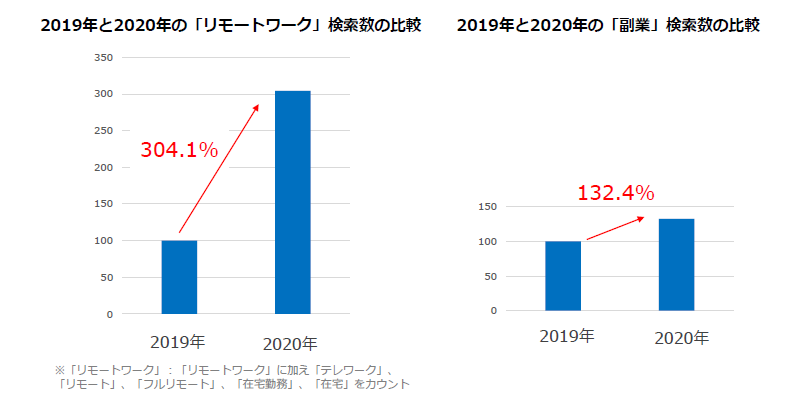 今年ははたらく環境が大きく変わった1年でしたが、「doda」内での2019年と2020年の検索キーワード数を比較すると、上昇率がもっとも高かったのが「リモートワーク」、次いで「副業」でした。