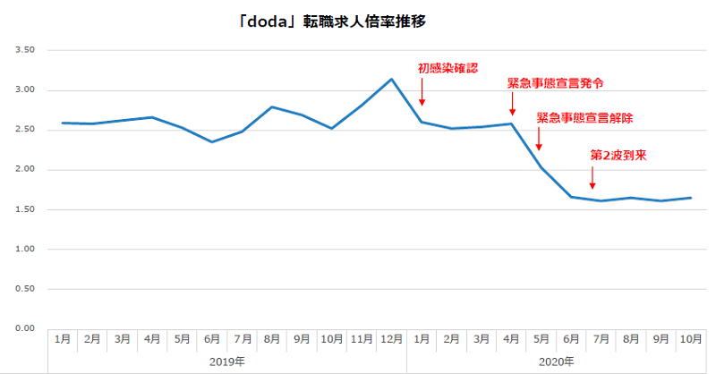 次に、全体の転職市場全体の動きを振り返ります。下のグラフは、2019年~2020年10月までの「doda」転職求人倍率の推移を表したものです。