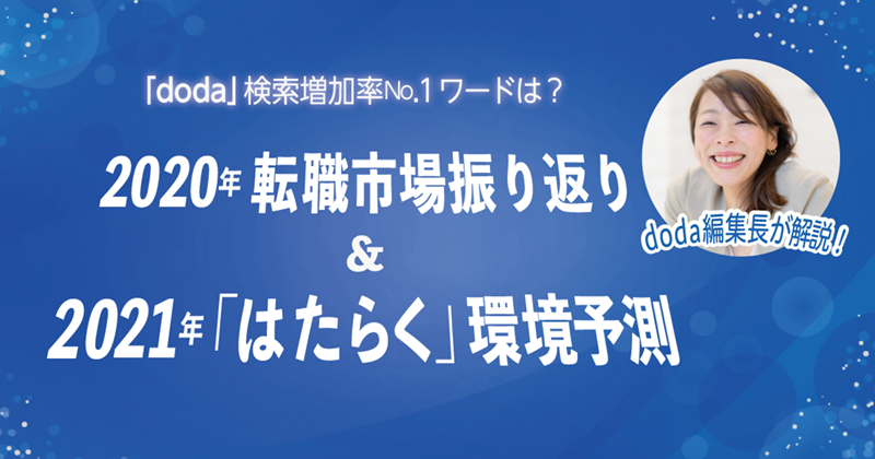 そんな2020年の転職市場の振り返りと、2021年の「はたらく」市場予測を、転職サービス「doda」の編集長を務める喜多 恭子(パーソルキャリア株式会社)が解説します。