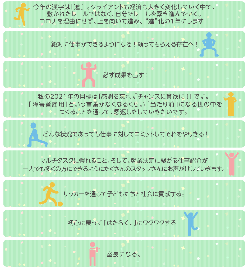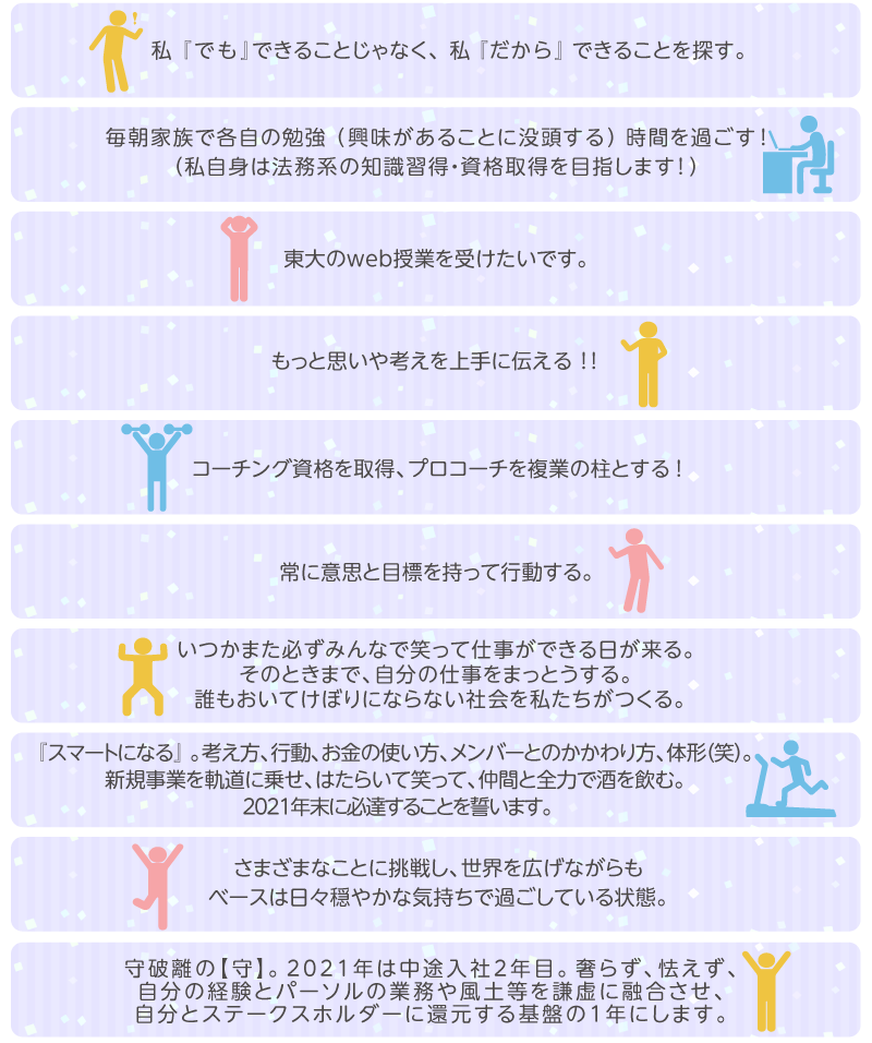 コロナ禍でも、前を向いて進もう!そんな願いが込められた目標が多数ありました。