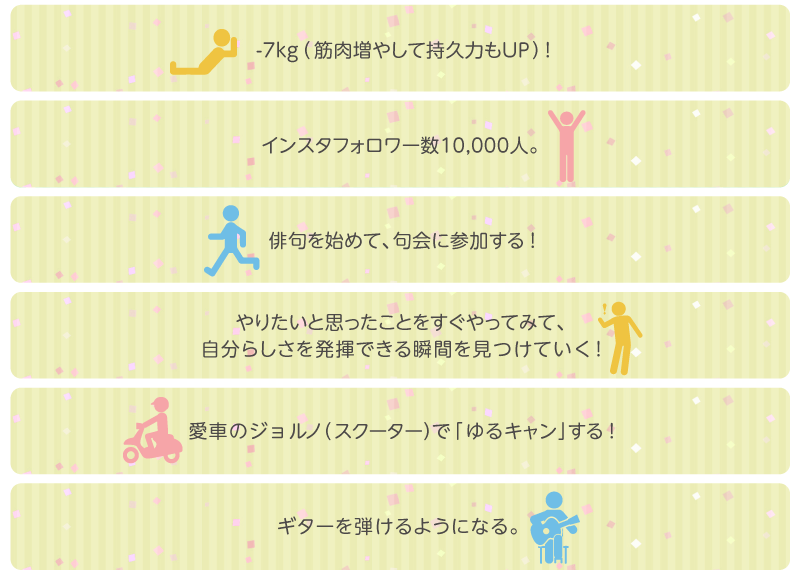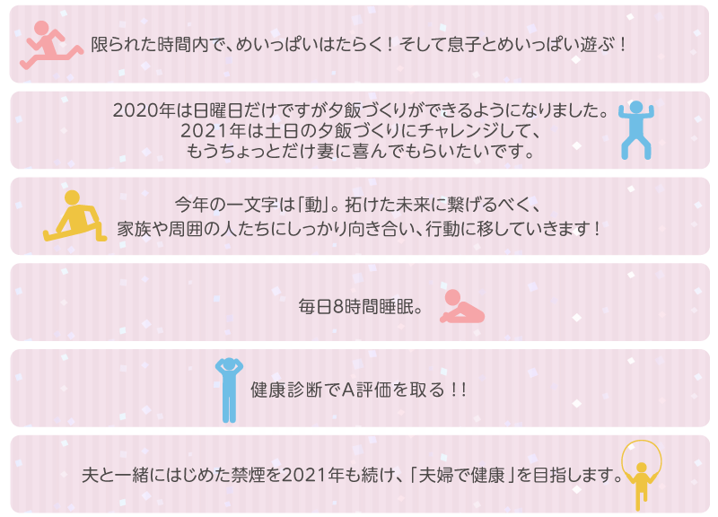 家族への愛を感じられる目標が目立ちました。自分以外の誰かの存在は、やる気をアップさせるだけでなく、心も満たすことになるのかもしれません。また、多忙な日々の中で忘れがちな「仕事をするにも遊ぶにも、『からだが資本!』」といことを思い出させてくれる目標も多くありました。