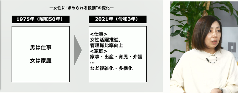 2000年代になると、企業が仕事と育児の両立支援制度を少しずつ取り入れるようになり、育児支援のための時短制度を設けたり保育所をつくったりといった動きが出始めます。しかし、男性の長時間労働が放置されていたため、結果的に家事育児を担うのは女性、ワンオペ育児問題は解決されず、はたらく女性の役割は増えるばかりでした。本日ご登壇の皆さんも、そうした葛藤に苦しまれた経験があるのではないでしょうか。