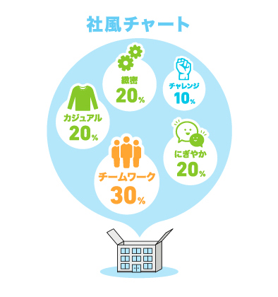 比較的カジュアルな環境で、プライベートとの両立もできるように考慮され、はたらき方もいろいろです。グラフの要素としてチャレンジ精神を入れたのは、社風というより、「なんでもチャレンジしていくぞ!」という私自身の想いからです。