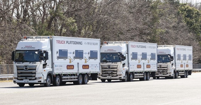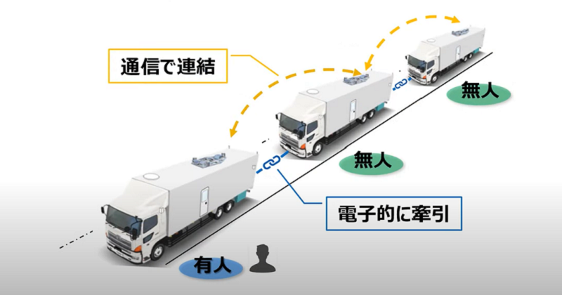 複数のトラックが連なって、自動で車間距離を保って走行することです。「後続車無人隊列走行技術」は、後続トラックには運転手が乗らずに、先頭車両のドライバーだけで複数台のトラックを追従走行させる技術です。