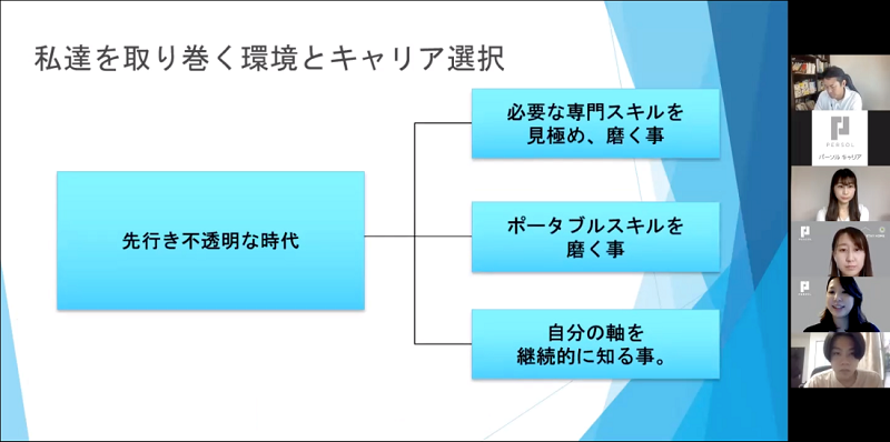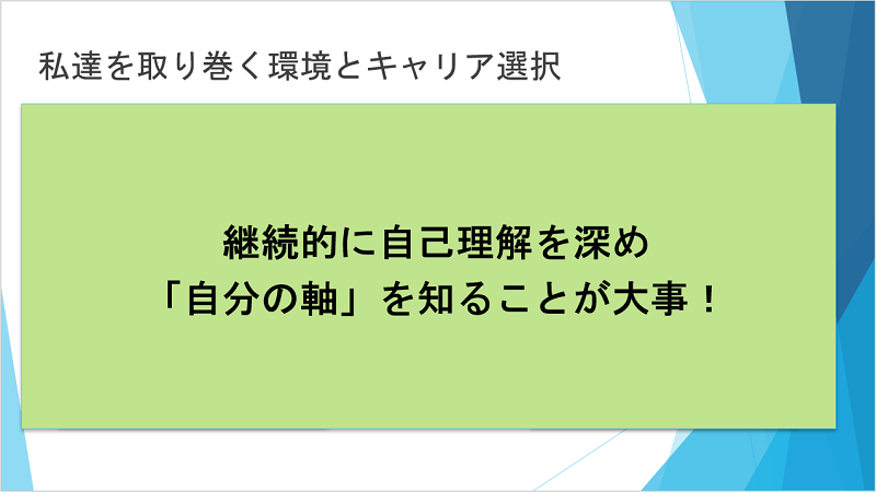 そして、「必要な専門スキル」は、時代によってニーズが変化していくため、常にキャッチアップして身に付けていくことが大切であること。「ポータブルスキル」は、論理的思考力や課題発見力、コミュニケーション能力などのことで、社会人になる前から身に付けられるスキルである旨を解説。さらに、多くの選択肢から納得のいく選択をするには、「自分の軸」を持つ必要があり、軸を見つけるには自己理解が必要であること。時代のニーズはもちろん、自身の価値観も経験で変わるため、「自分の軸を継続的に知ること」が大切であることを伝えました。