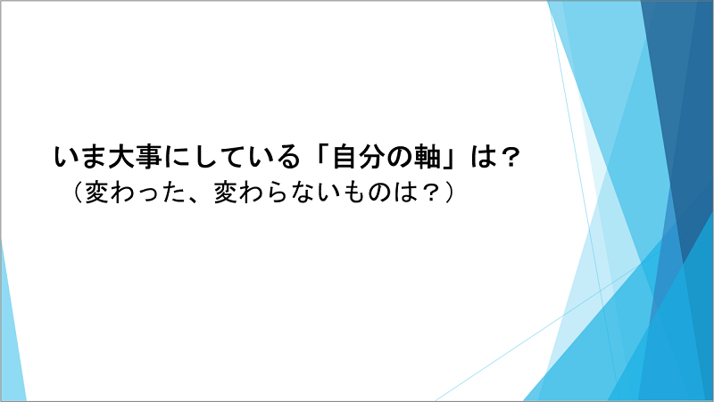 そして、最後に全体メッセージとして、自分の軸を知ることは納得のいくキャリア選択をするのにとても重要だが、価値観などは経験や置かれた状況によって変わるものなので、「いまの自分」を『自己理解』することが大切であることが説明され、90分のワークショップは幕を閉じました。
