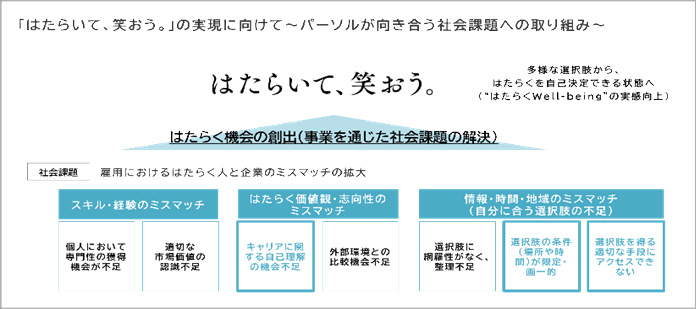 さまざまな事業・サービスを通じて、はたらく人々の多様なニーズに応え、可能性を広げることで、世界中の誰もが「はたらいて、笑おう。」を実感できる社会を創造します。