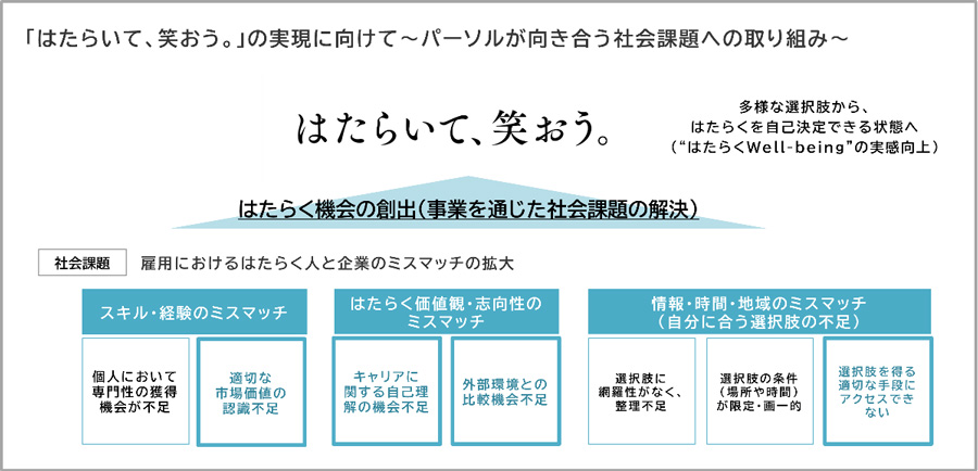 さまざまな事業・サービスを通じて、はたらく人々の多様なニーズに応え、可能性を広げることで、世界中の誰もが「はたらいて、笑おう。」を実感できる社会を創造します。