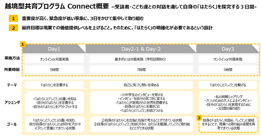 また、現在Connectを社員の越境研修としてほかの企業にも取り組んでいただける仕組みをつくっています。より多くの企業に参画をいただくことで、将来世代がさまざまな大人から学び、同時に現役世代が自身のはたらく目的に立ち返る機会を両立していきたいと考えています。
