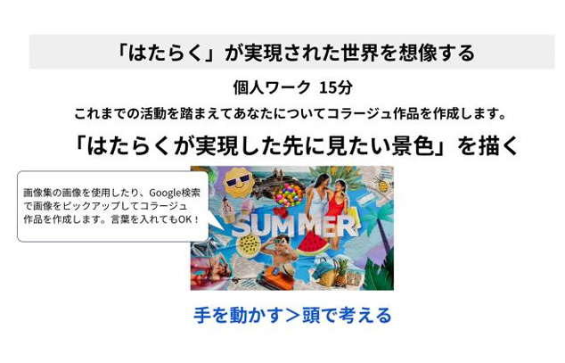 そこでConnect研修では、本人の潜在的な想いが自然に表れるよう、コラージュを使ったワークを取り入れています。自分で作成したコラージュをもとに他者と対話することで、「本当はこんなことを大事にしていたんだ」「これを原動力にしていたんだ」といった自分自身の本音に気付いていくんです。